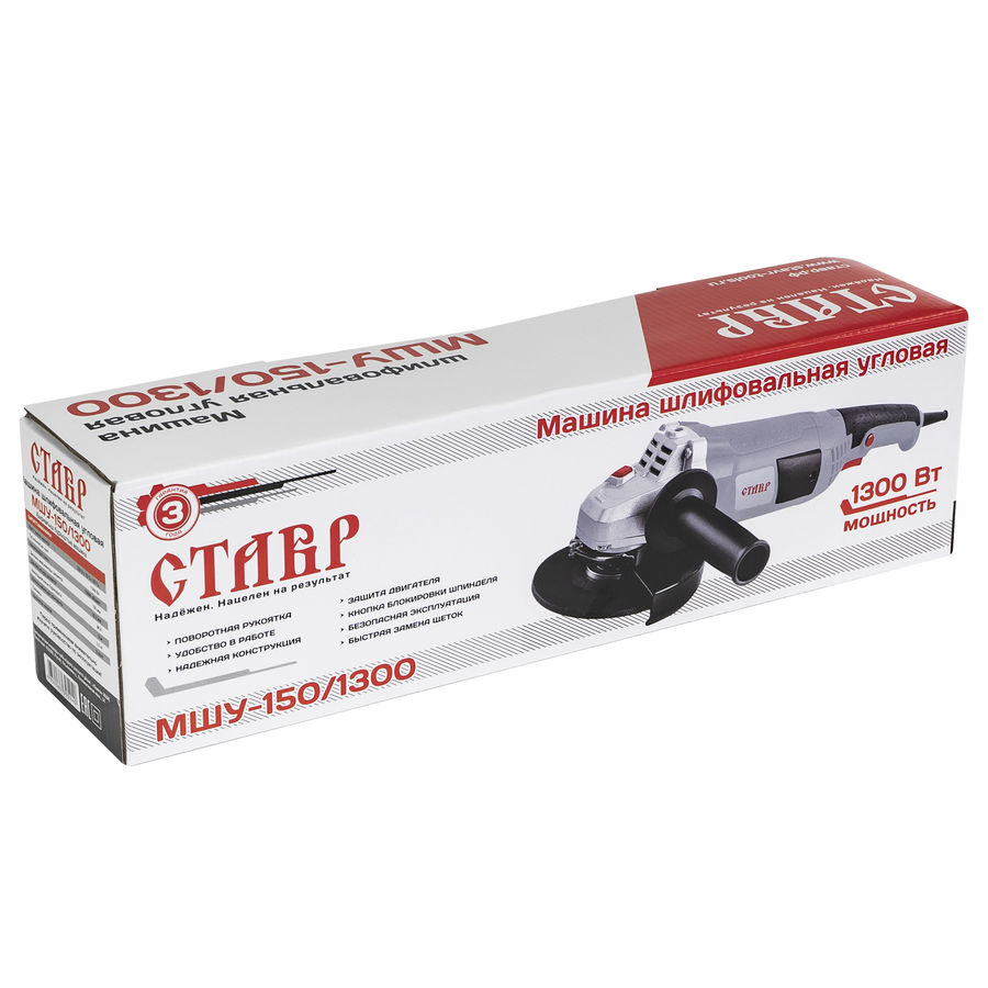 Машина шлифовальная угловая СТАВР МШУ-150/1300 применяется для резки и шлифования материалов в рамках бытовых нужд. Поворотная рукоятка: Основная рукоятка поворачивается в обе стороны, обеспечивая удобство при резке и шлифовке. Надежная конструкция: "Главная пара" шестерен изготовлена из каленой стали, обмотки двигателя залиты высокотемпературным лаком и надежно бандажированы. Защита двигателя: Специальная конструкция обеспечивает надежную защиту от пыли. Кнопка блокировки шпинделя: Дает возможность легко и быстро сменить диск. Быстрая заменя щеток: Имеется прямой доступ к щеточному узлу, что позволяет легко заменить угольные щетки, не разбирая корпус инструмента. Удобство в работе: 3-х позиционная боковая рукоятка делает работу с инструментом более удобной.
