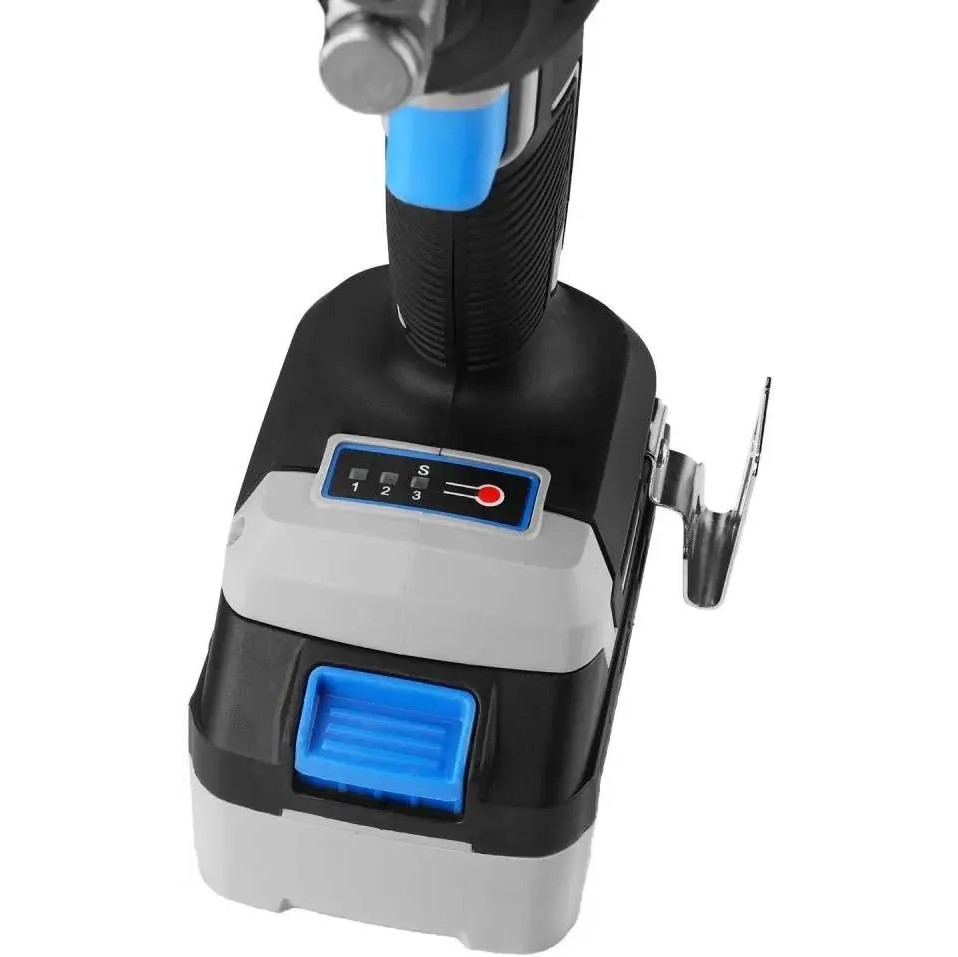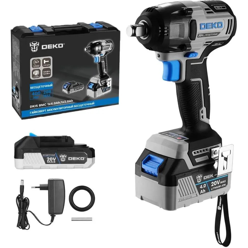Гайковерт, 2 шт. АКБ, зарядное устройство, скоба поясная, саморез, уплотнительное кольцо, штифт, руководство по эксплуатации, кейс.