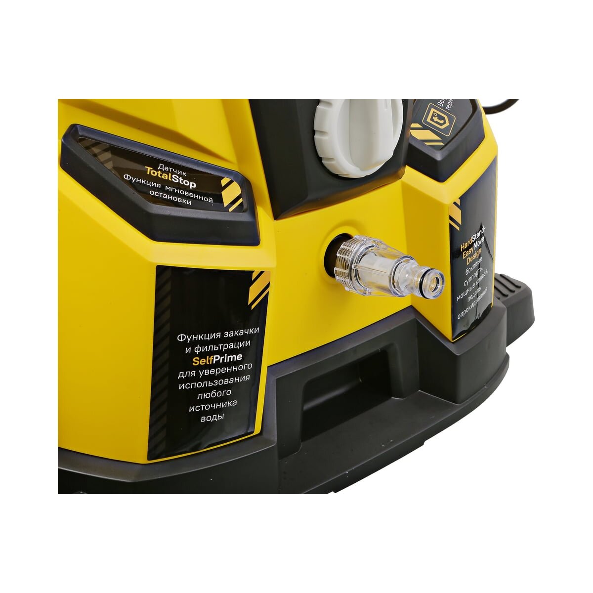 Модель укомплектована пеногенератором с регулятором подачи пены, что упрощает процесс очистки сложных загрязнений.