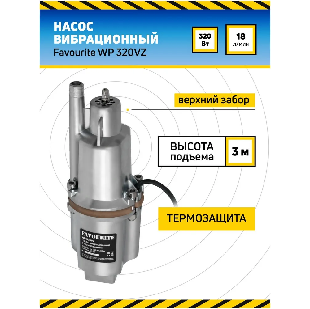 Вибрационный насос FAVOURITE с термозащитой, верхний забор WP 320VZ предназначен для перекачивания воды из водоемов, колодцев и резервуаров диаметром более 100 мм.