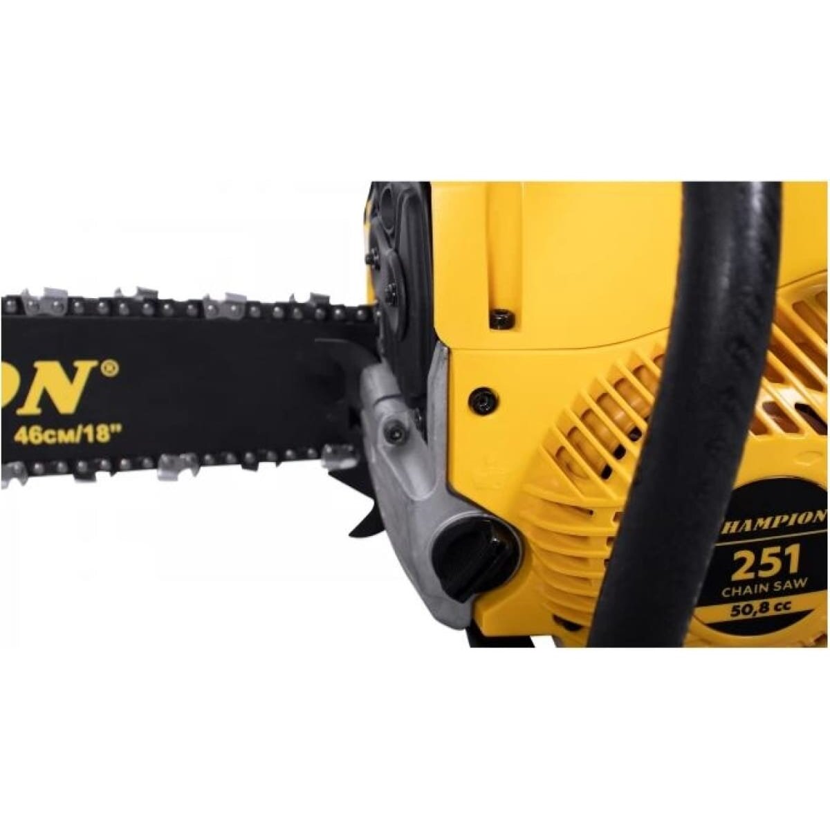 У цепи пилы профессиональный шаг 0,325 дюйма под широкий паз 1,5 мм. Бензопила Champion 251-18 оборудована подогревом карбюратора, позволяющим эксплуатацию при отрицательных температурах. В основании пильной шины есть стальной зубчатый упор, упрощающий распиловку бревен больших диаметров. Подача смазывающего масла на шину и цепь производиться автоматически посредством металлического насоса. Двигатель бензопилы работает на смеси двухтактного масла с бензином в пропорции 1 к 50.