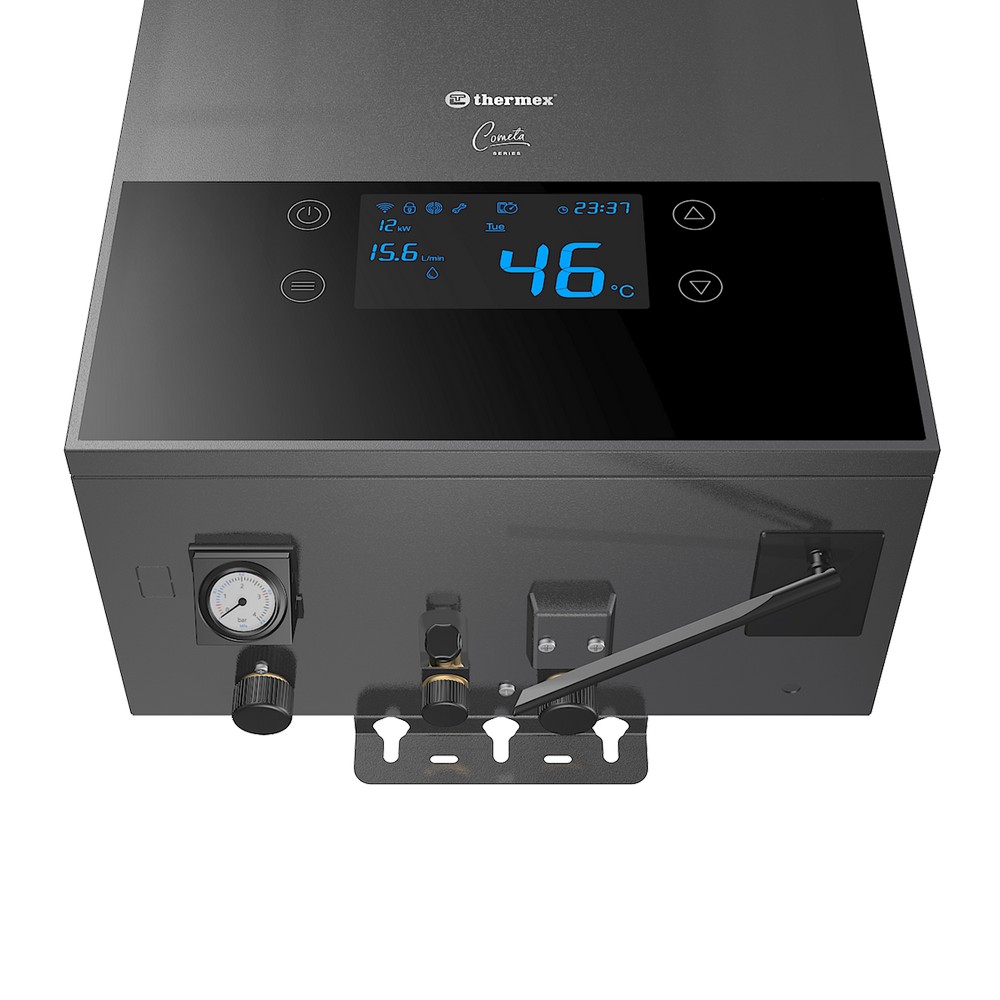 4.Комфортное управление: Электронное управление через панель на фронтальной стороне котла обеспечивает мгновенный доступ ко всем необходимым данным по работе оборудования. Благодаря технологии Wi-Fi Motion, вы можете управлять котлом дистанционно с помощью приложения Thermex Home, настраивая алгоритмы нагрева и температуру.