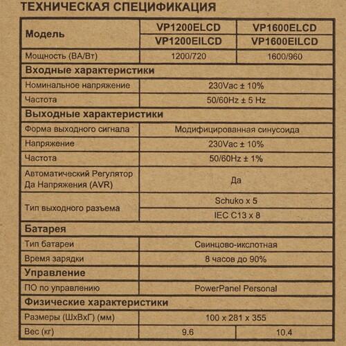ИБП CyberPower VP1600EILCD линейно-интерактивного типа представляет собой надежный вариант резервного источника питания, который применяется для защиты компьютеров и другой техники от скачков напряжения, внезапного отключения электроэнергии и других сбоев. Полная выходная мощность составляет 1600 ВА. Данная модель оснащена 8 компьютерными розетками, 4 разъемами питания UPS, портом USB, сетевым разъемом RJ-45. Для зарядки требуется 8 часов. CyberPower VP1600EILCD реализованы функция холодного старта и технология автоматической регулировки напряжения, что гарантирует высокие показатели стабильности. Для удобства просмотра сведений о состоянии питании и батареи установлен ЖК-дисплей.