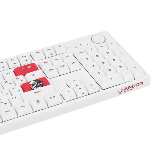 Клавиатура ARDOR GAMING Katana [AG-ZD-104GT-XDA-HS-W] выполнена в белом корпусе с красными клавишами и рисунками в самурайском стиле. Она разработана для точного и комфортного управления в играх. Механические переключатели Gateron Mint с укороченным ходом 2 мм и ресурсом 80 млн нажатий обеспечивают быструю реакцию. Благодаря смазанным стабилизаторам каждое нажатие выполняется легко и плавно.