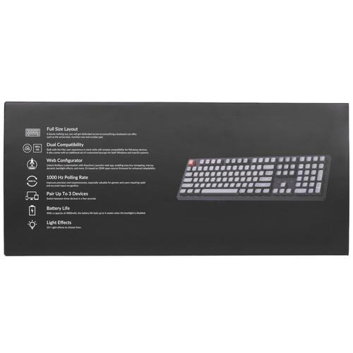 Беспроводная механическая клавиатура в классической 100% раскладке. Полностью программируемая, поддерживает 2.4 ГГц, Bluetooth и подключение по проводу. В комплекте командные клавиши для Windows и macOS.
