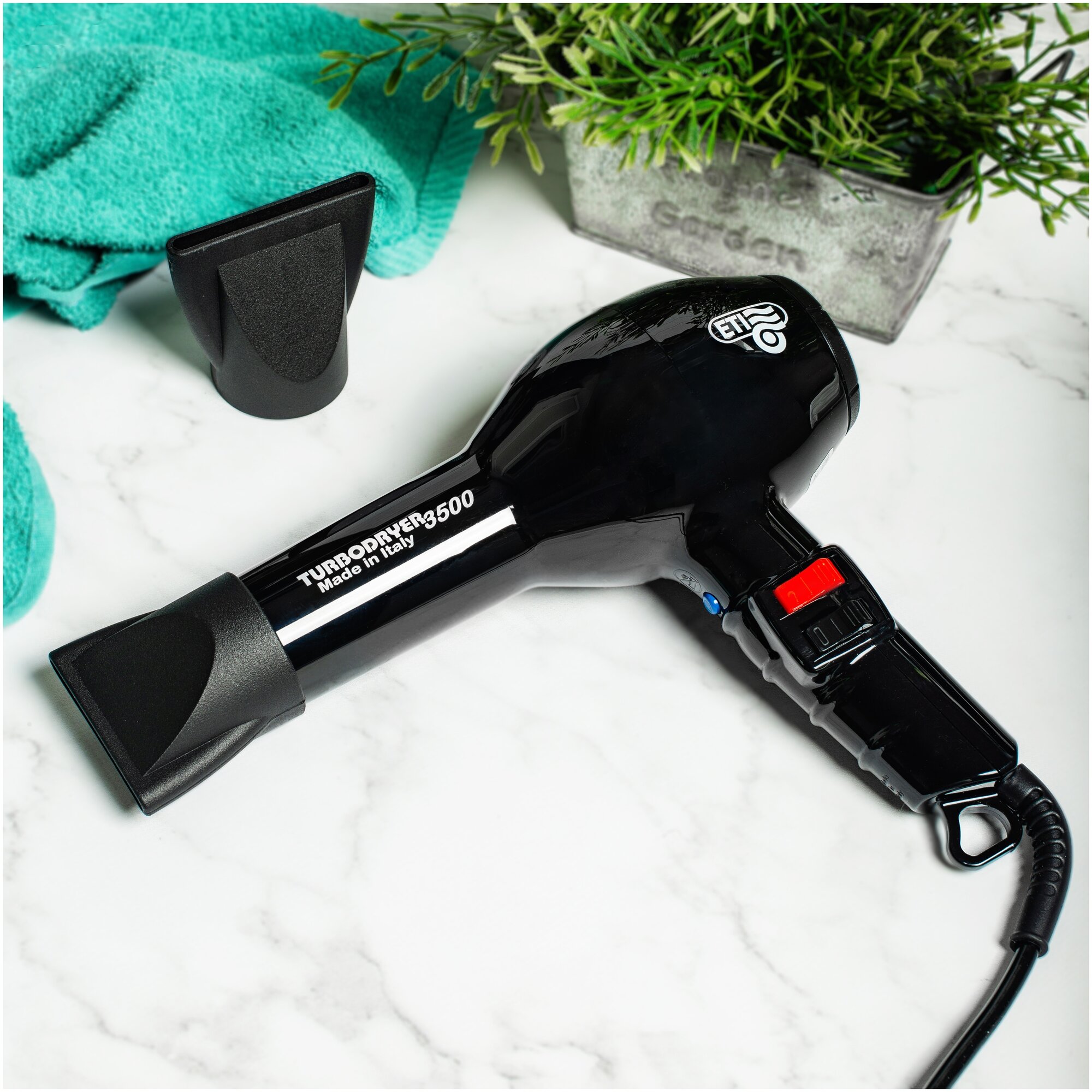 Профессиональный фен ETI Turbodryer 3500 для мастеров своего дела. Создан для ежедневной работы в условиях салона. Современный мощный мотор переменного тока с ресурсом 2500 часов работы не перегревается. Равномерно нагревает воздух и быстро переключается между температурами. Стильный фен для укладки отличается от других не только основными характеристиками, но и продуманным дизайном. Обдув воздуха равномерно распределяется по всей длине. Ручка комфортно ложится в руку. Положение кнопок позволяет удобно переключаться между 4 температурными режимами и двумя скоростями. Вес фена 595 грамм совершенно не ощущаются в руке, благодаря оптимальному распределению веса. Решетка воздухозаборника легко снимается и очищается. Длина провода 3 метра позволяет свободно перемещаться вокруг рабочего пространства. Мощность 2000 Вт. Мотор: АС. Скорость воздушного потока: 83 м куб/час. Шум: 70 дБ. Режим холодного обдува: есть. Керамическая решётка. Две насадки в комплекте. Сделано в Италии.