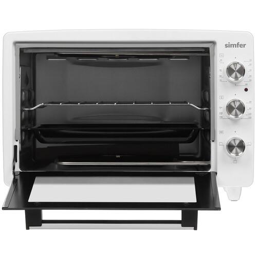 Ростер Simfer M3411 представляет собой электрическую мини-печь с широким функционалом. При грамотном использовании настольной духовки удается приготовить различные блюда, включая мясные, рыбные, овощные, выпечку и многое другое. Три режима готовки на выбор пользователя – с верхним нагревом, с нижним нагревом и их комбинация. Эстетическая привлекательность внешнего вида бытового устройства, в дизайне которого преобладает белый цвет. Вместительность камеры для готовки, объем которой равняется 34 литрам. Серьезным конкурентным преимуществом электропечи, которое заслуживает отдельного рассмотрения выступает конструкция. Она предусматривает несколько особенностей, в том числе: ручку с защитой от нагрева, позволяющую открывать дверку в любое время без риска обжечься; nермоизоляцию корпуса и ножек, которая исключает нагревание поверхности; aнтискользящее покрытие ножек, обеспечивающее устойчивое положение устройства; наличие удобной панели управления с возможностью установки трех обязательных параметров – температуры, режима и длительности приготовления; использование хромированной стали, что позволяет добиться как надежности и долговечности мини-печи, так и практичности в эксплуатации.