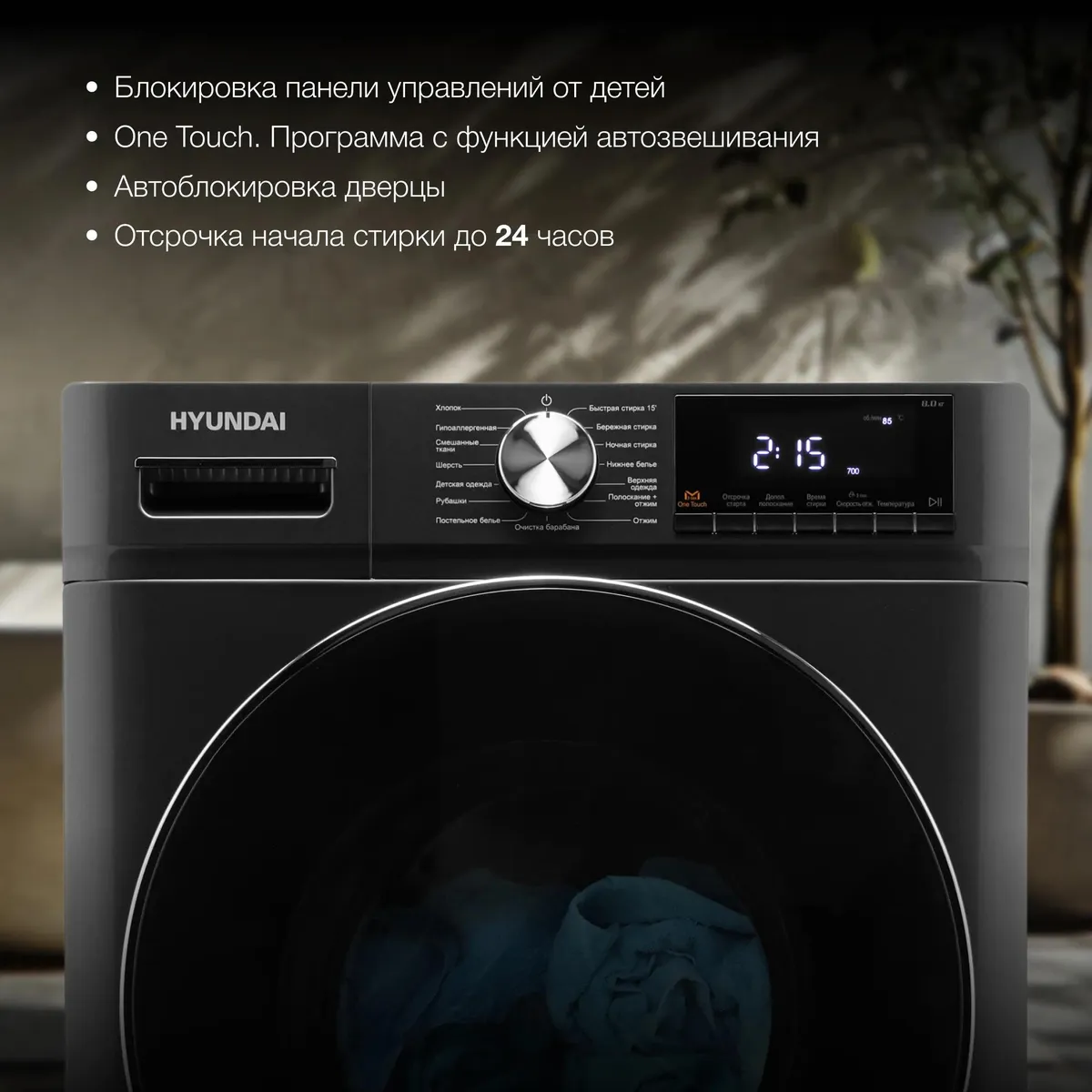 При активации отжима со скоростью 1400 об/мин Hyundai WMA8407 удаляет влагу из плотных тканей, сокращая время на сушку. Для тонких тканей подбирается меньшая скорость. Особенность модели в режиме One Touch, в котором машина взвешивает белье и устанавливает время и температуру стирки. Активация дополнительного полоскания позволяет избавиться от остатков порошка. Прибор поддерживает отсрочку старта до 24 ч, чтобы вы могли отложить начало стирки на удобное время.