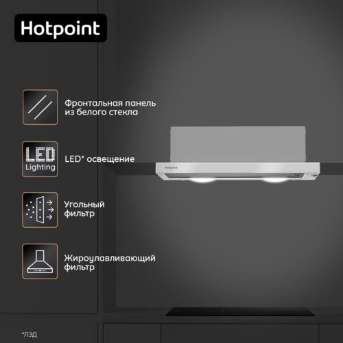 Вытяжка Hotpoint HPTF 62HS WH в стильном белом корпусе. 3 скорости и подсветка. Вытяжка может работать в режимах простой циркуляции и отвода запахов из помещения. Модель оснащена 2 LED-лампами с мощностью по 4 Вт, которые выполняют функцию подсветки.