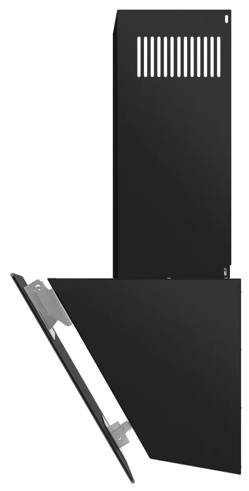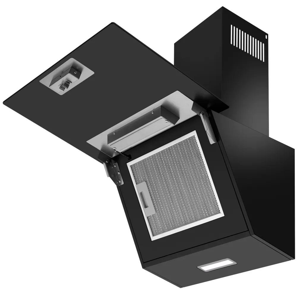 - Элегантный Дизайн: Черное стекло и наклонная конструкция придают вытяжке современный и стильный вид.