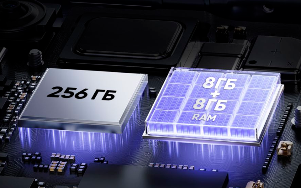Внутри realme 12 — мощный восьмиядерный процессор MediaTek Dimensity 6100+. Этот чип обеспечивает высокую производительность и эффективность энергопотребления. Также смартфон быстро работает и за счет объема ОЗУ — здесь предусмотрено 8 ГБ оперативной памяти. Объем внутреннего накопителя — 512 ГБ.