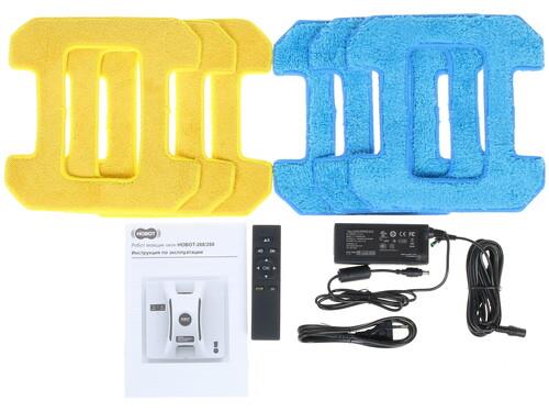 адаптер питания, документация, кабель питания, пульт ДУ, салфетка для влажной уборки х 3 шт,салфетка для сухой уборки х 3 шт, страховочный трос, удлинитель сетевого шнураещё