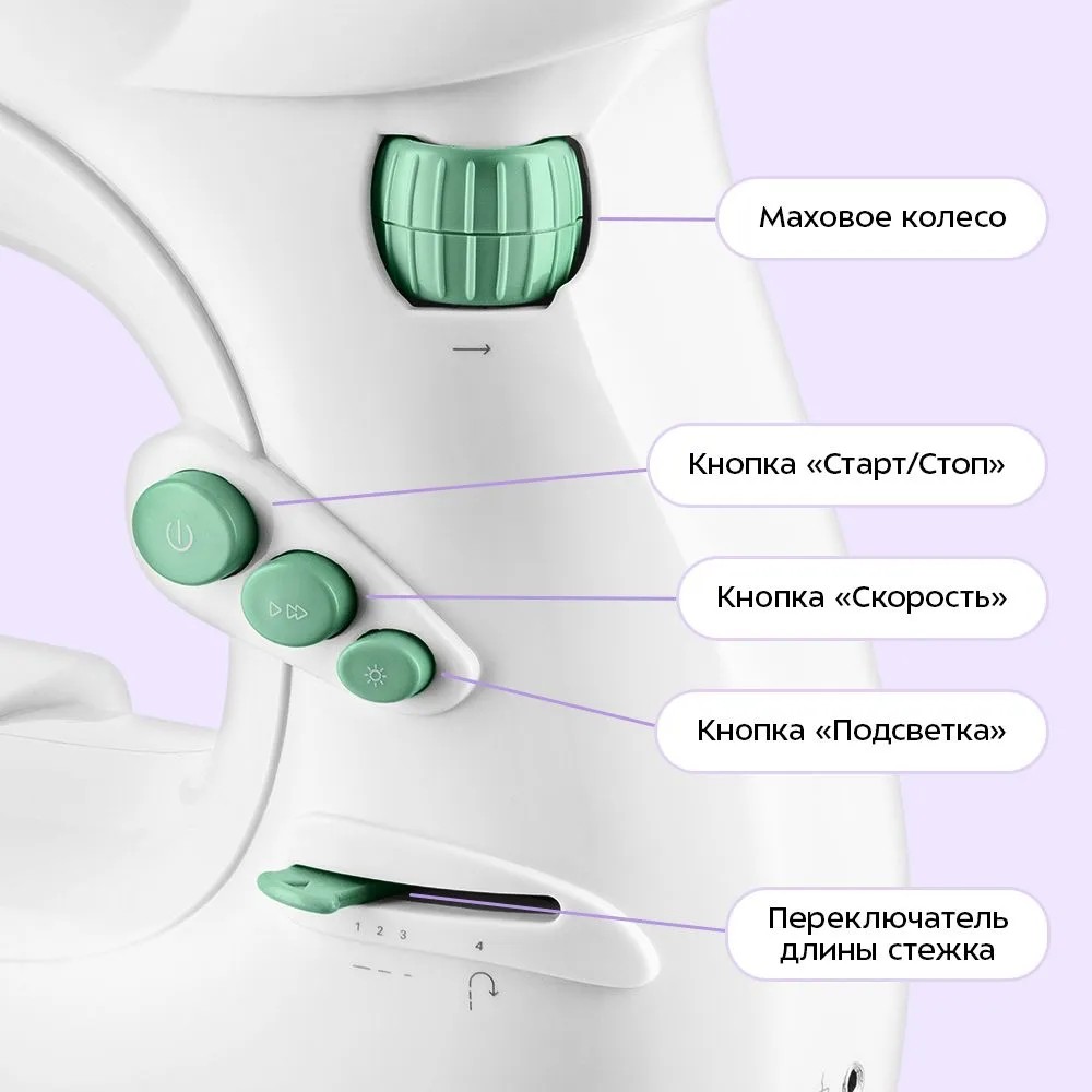 Функциональные особенности швейного оборудования: Реверс, Регулировка скорости шитья, Регулятор длины стежка, Подсветка рабочей зоны
