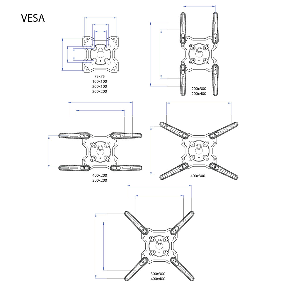 Поддержка крепления VESA 75×75, 100×100, 200×100, 200×200, 200×300, 300×200, 400×200, 300×300, 400×300, 400×400