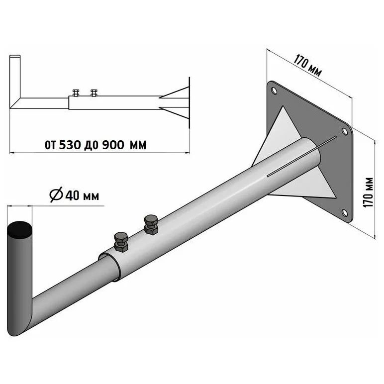 Кронштейн телескопический, применяется для установки антенн и спутниковых тарелок на балконы, оконные рамы, стены строений, фасады зданий и сооружения. Регулировка выноса кронштейна позволяет подобрать необходимый вылет крепления антенны или спутниковой тарелки к стене. Крепление антенны или спутниковой на кронштейн поможет существенно улучшить качество принимаемого сигнала и избавит от помех вносимых различными электронными устройствами, а также стенами и крышами домов. Кронштейн изготовлен из стали, окрашенной порошковой краской, что обеспечит долговечную службу в неблагоприятных условиях окружающей среды. Изготовлен с учетом специфики Российского климата. Вылет от стены: от 60 см до 110 см Конструкция: телескопическая Производство: Россия.