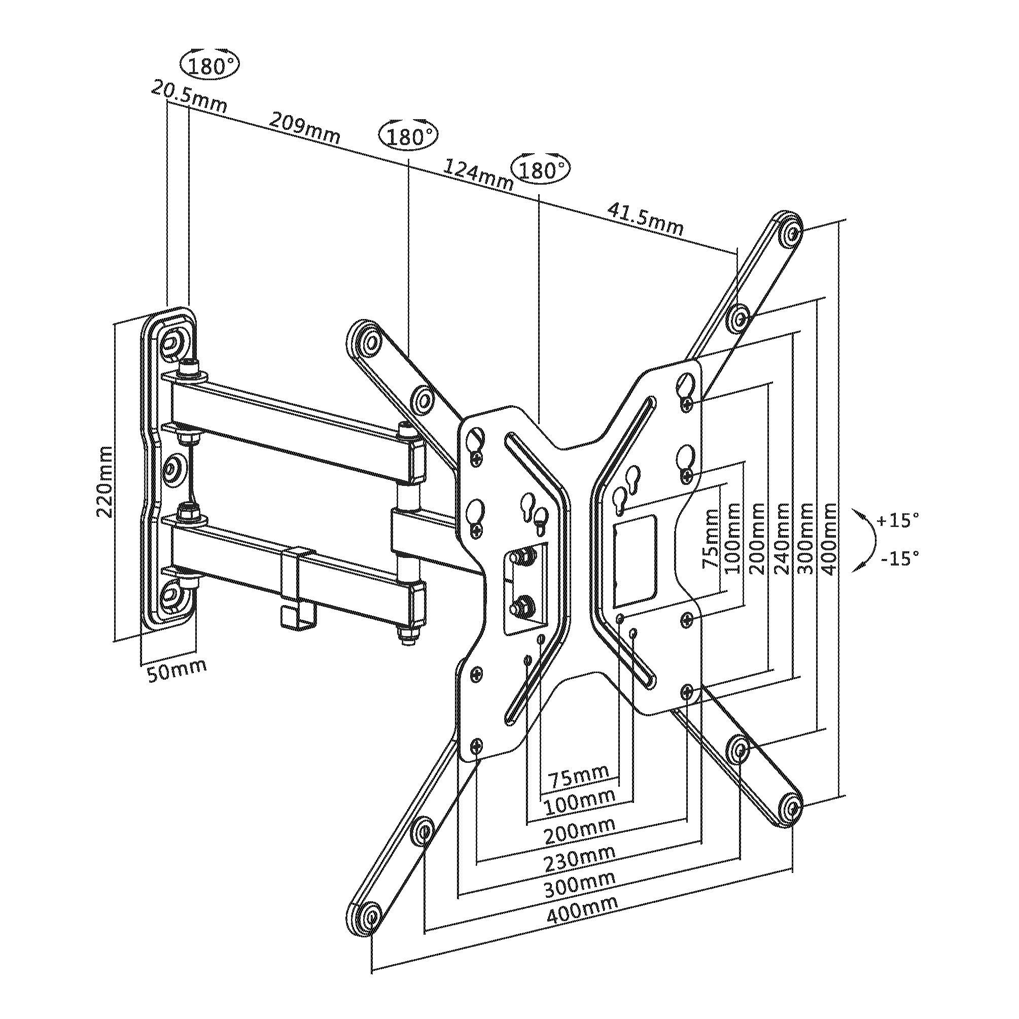 VESA: 75x75, 100x100, 200x100, 200x200, 300x300, 400x400