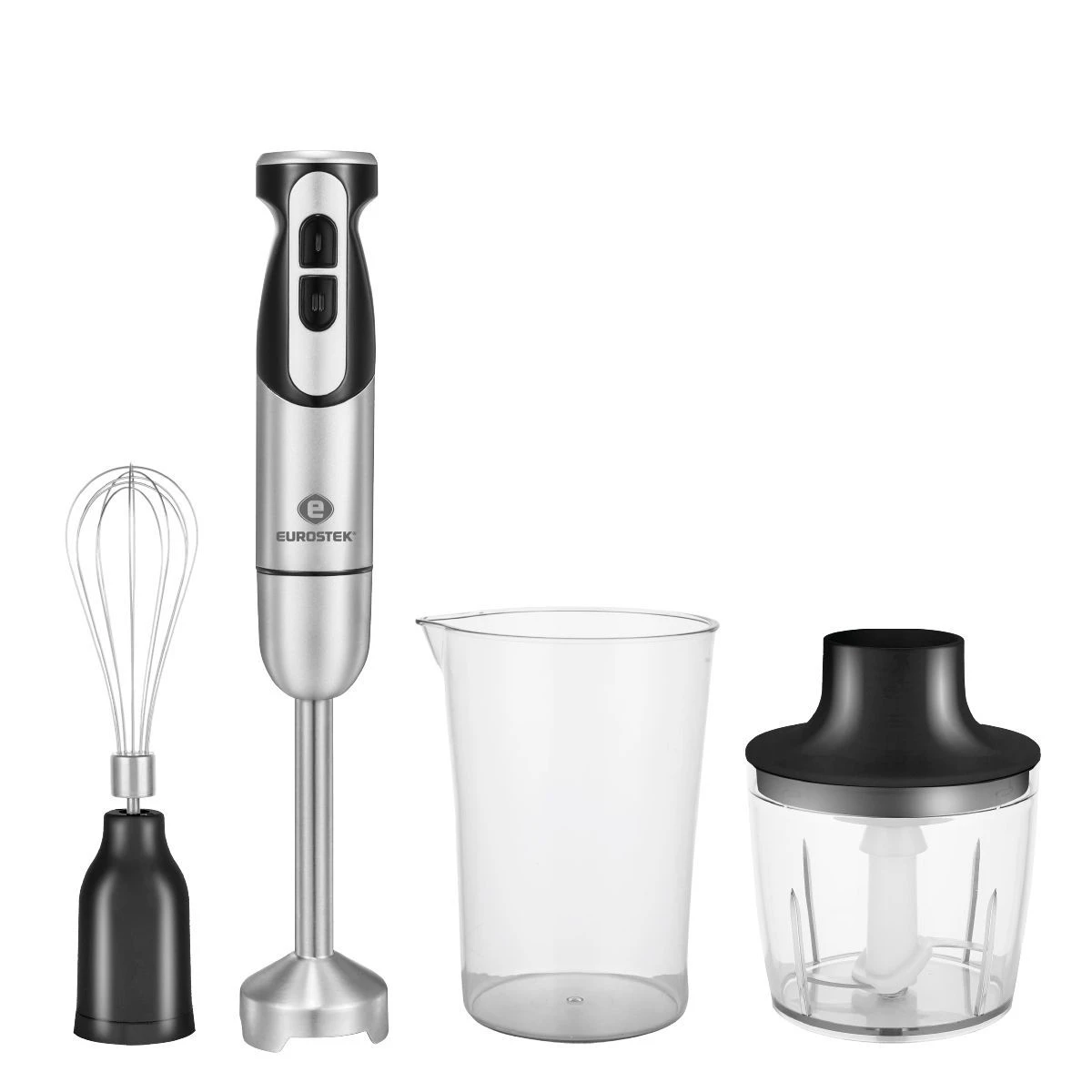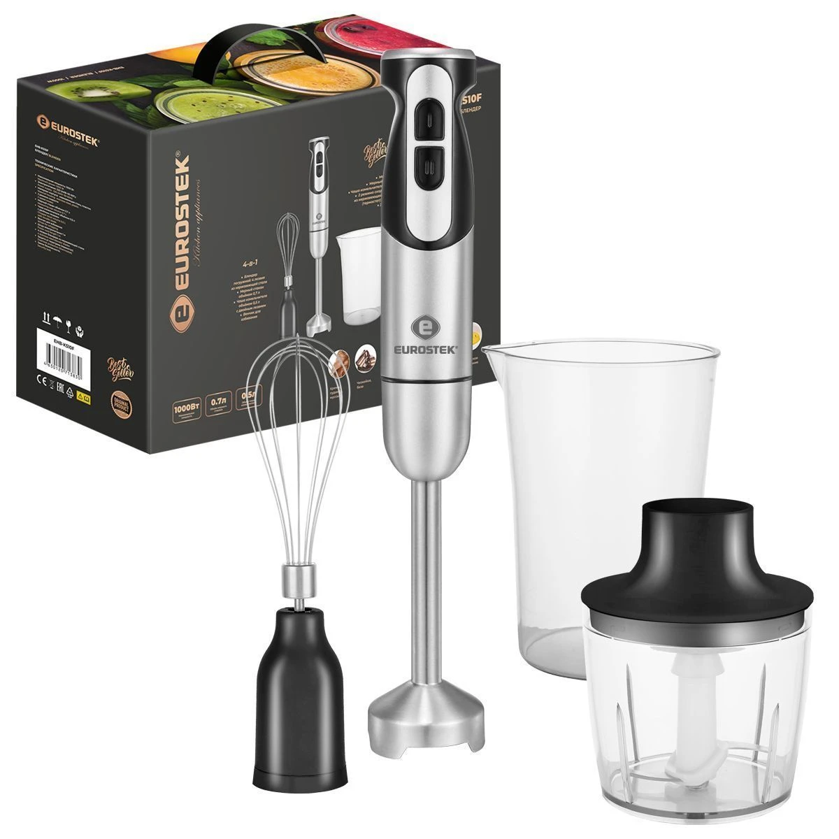 Блендер погружной EHB-KS10F. Мощность 1000 Вт, низкий уровень шума, 2 скорости, стальной нож, мерный стакан - 700мл, стальной венчик, измельчитель - 500мл