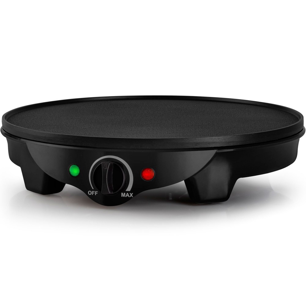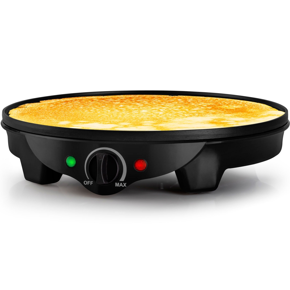 Испечь красивые румяные блинчики диаметром 30 см для всей семьи или большой компании гостей позволит блинница Maxwell MW-1973 с номинальной потребляемой мощностью 1100-1300 Вт (электропитание: 220-240 В~ 50-60 Гц). Выбирать оптимальную температуру нагрева прибора можно самостоятельно — поворотом специального регулятора. Благодаря высококачественному антипригарному покрытию поверхности устройства, блинчики получаются невероятно аппетитными. Да и мыть прибор после использования очень легко. В комплект с блинницей входят две деревянные лопаточки: для распределения теста по поверхности и для переворачивания изделий.