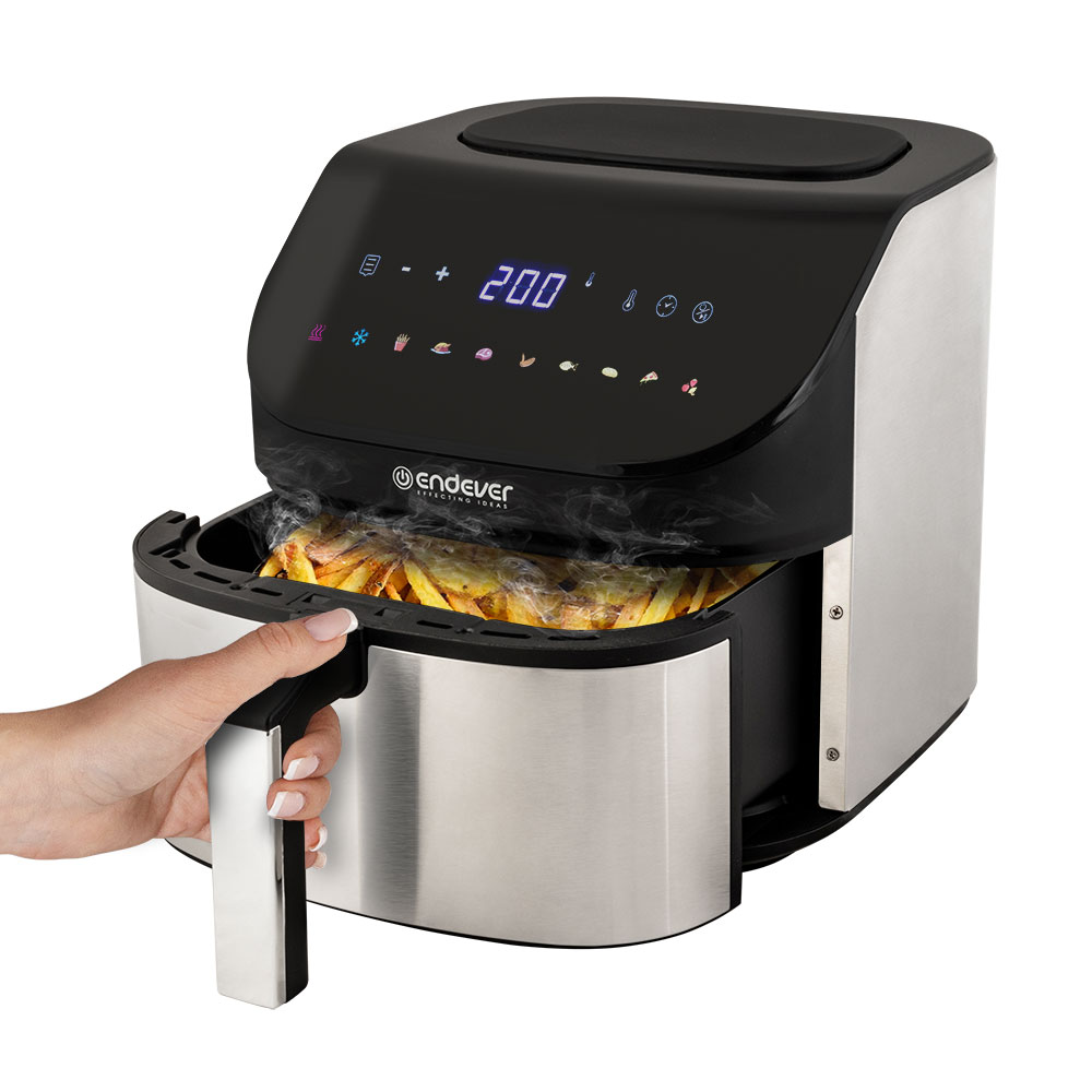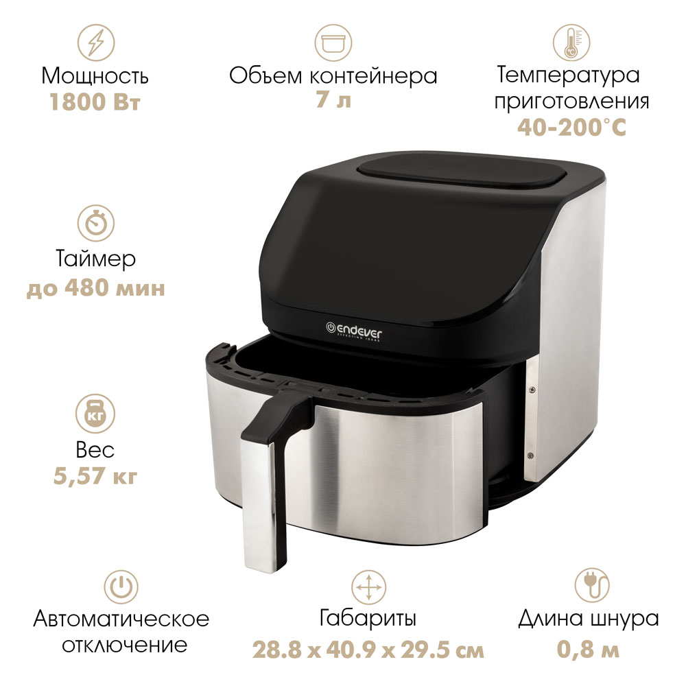 10 автоматических программ, LED дисплей, Контейнер с антипригарным покрытием, Таймер до 480 минут, Большой объем чаши на 7 литров, Сенсорная панель управления, Функция размораживания, Функция сушки овощей и фруктов, Регулировка времени и температуры приготовления , Обжаривание продуктов циркулирующим горячим воздухом без использования масла, Равномерная конвекция для лучшей прожарки, Автоматическое отключение, Защита от перегрева