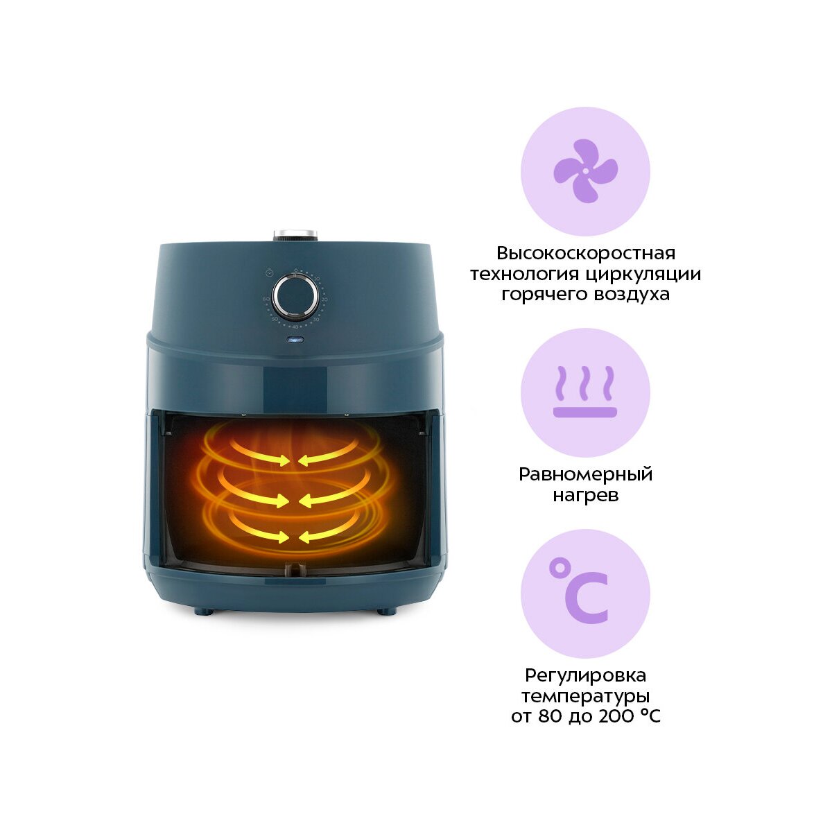 При помощи системы циркуляции горячего воздуха продукты равномерно обжариваются со всех сторон и получаются нежными внутри и хорошо запечёнными снаружи. Продукты практически не пригорают, а сам процесс готовки не требует постоянного присутствия на кухне.