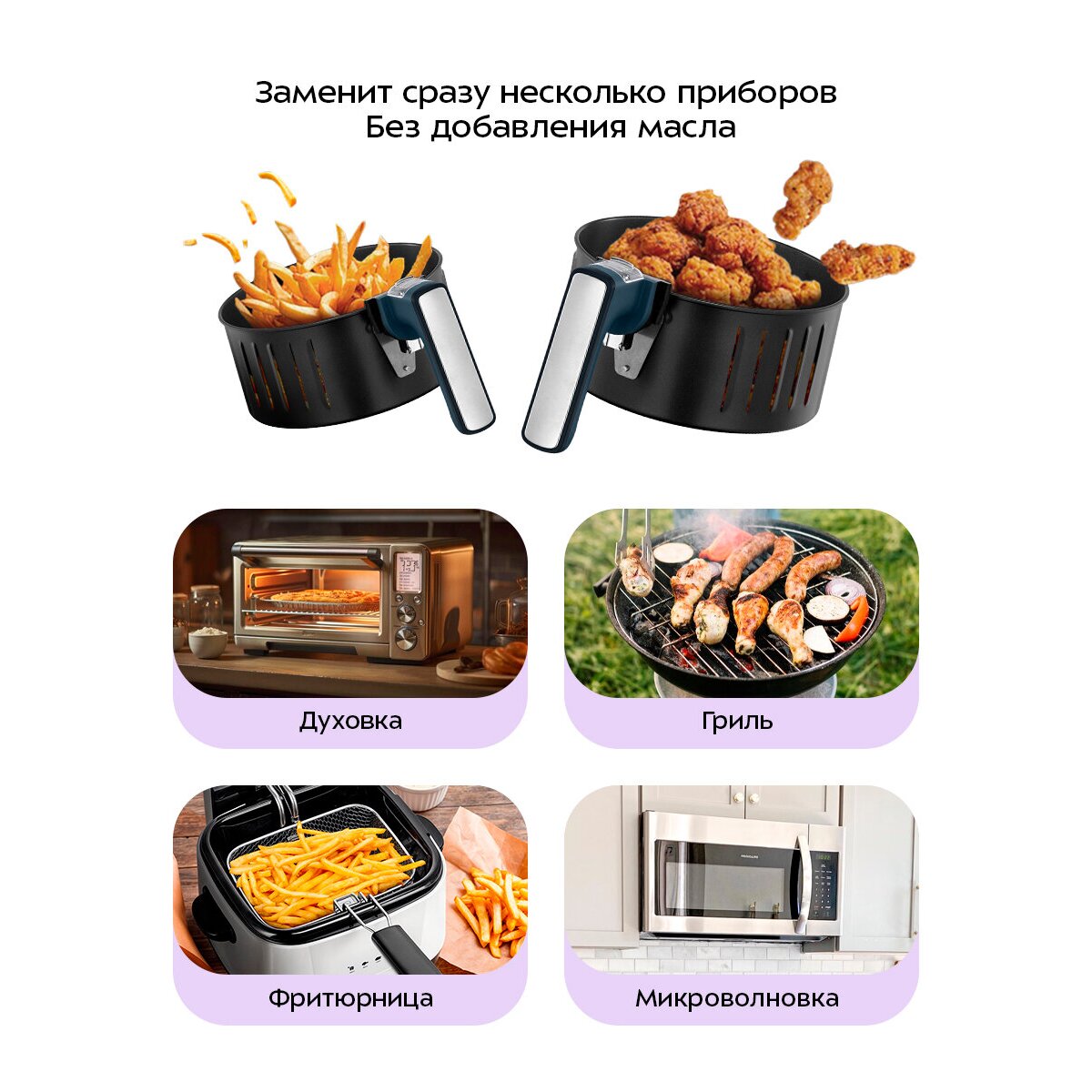 Аэрогриль КТ-8118 заменит сразу несколько приборов одним собой, так как имеет все функции, включающие в себя: запекание, как в духовке, гриль, фритюр и подогрев, как в микроволновке. При этом он не займёт много места на кухне!