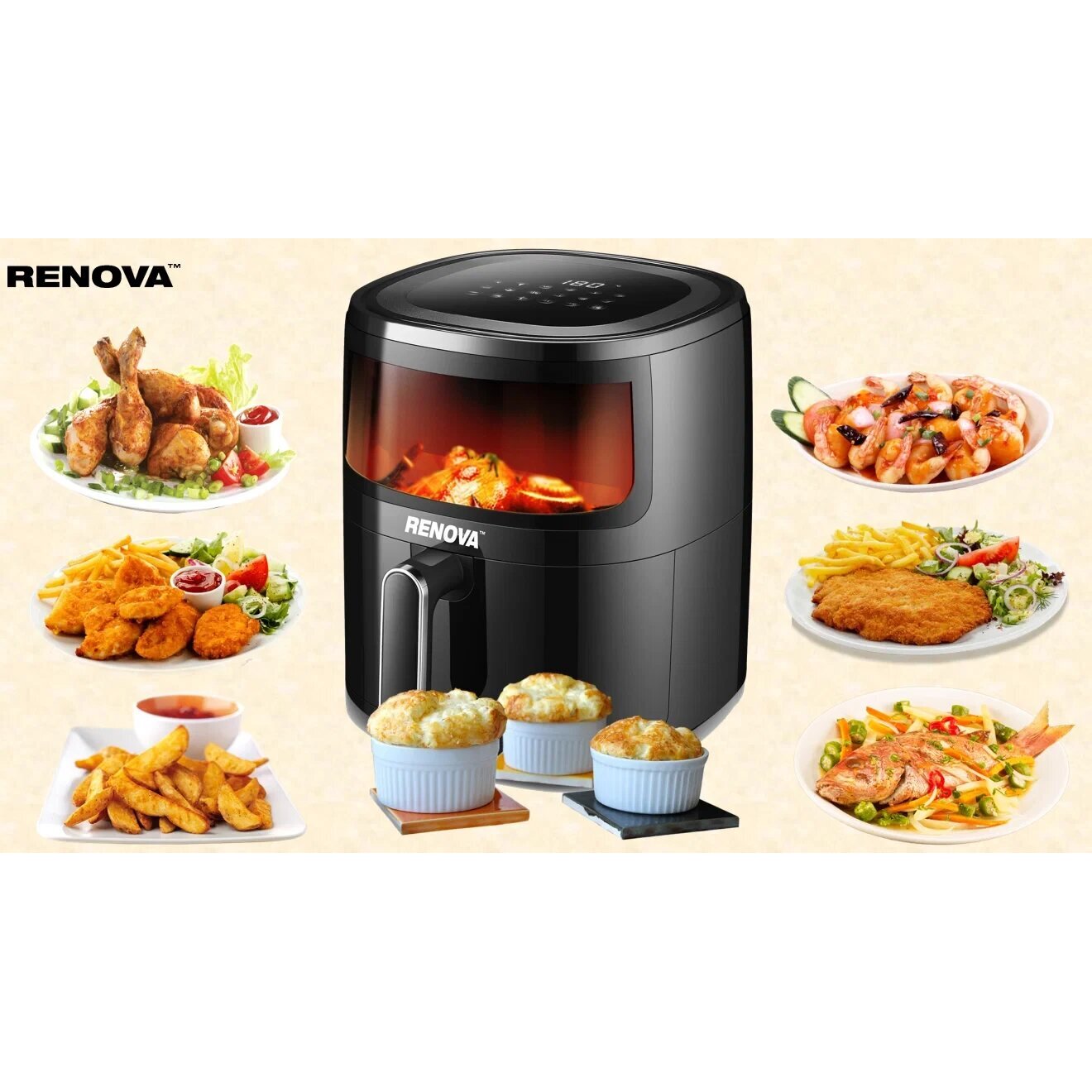 RENOVA AF5-DTB1 оснащен электронной системой управления, которая позволяет точно регулировать температуру от 80 до 200 градусов с шагом в 1 градус. Это дает возможность готовить разнообразные блюда, от овощей и мяса до выпечки и десертов.