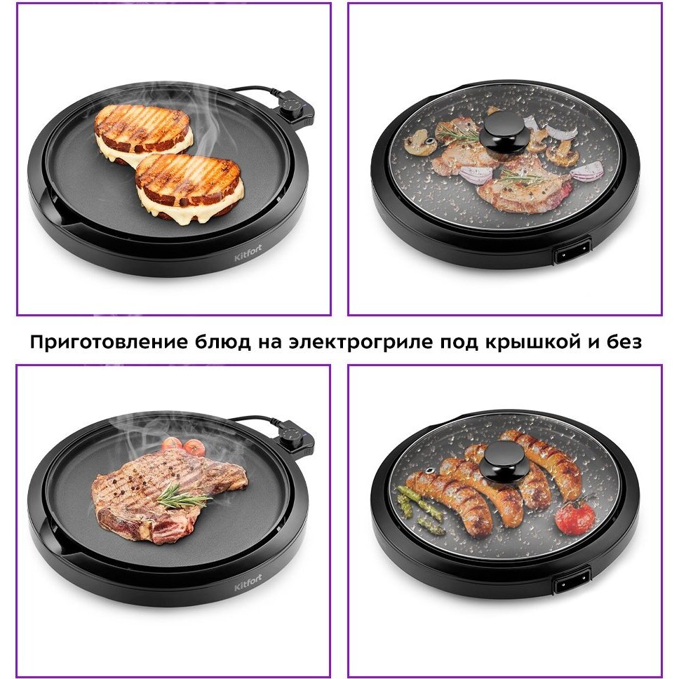 С помощью электрогриля КТ-1680 можно приготовить мясо, рыбу, овощи, сосиски-гриль, бутерброды,панини, сэндвичи, гренки, тосты и многое другое. Шероховатая поверхность панели и высокой t нагрева способствует быстрому приготовлению продуктов.