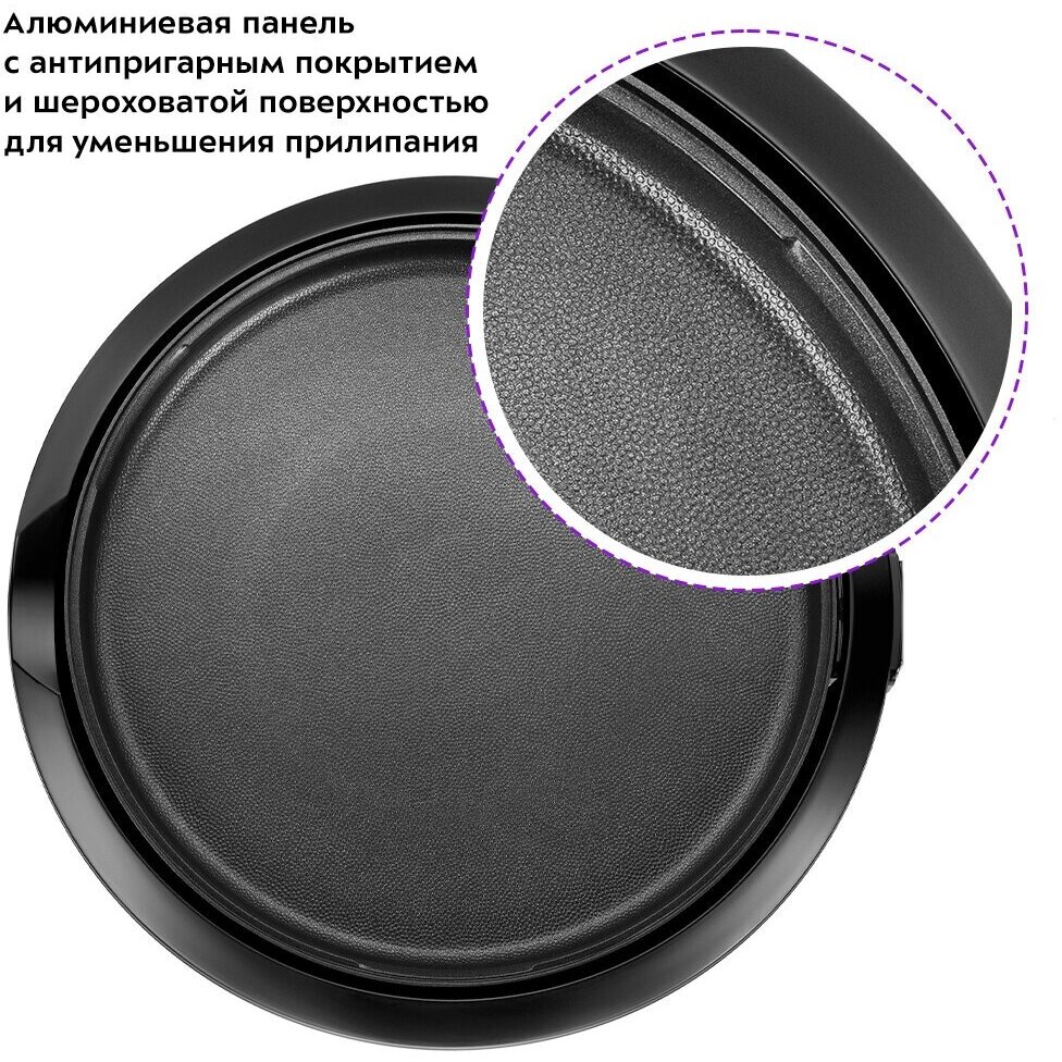 Панель изготовлена из алюминия с нанесённым антипригарным покрытием. Поверхность панели шероховатая для уменьшения прилипания ингредиентов, а также для более лёгкой очистки. Благодаря встроенному нагревателю время нагрева и приготовления сокращается.