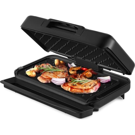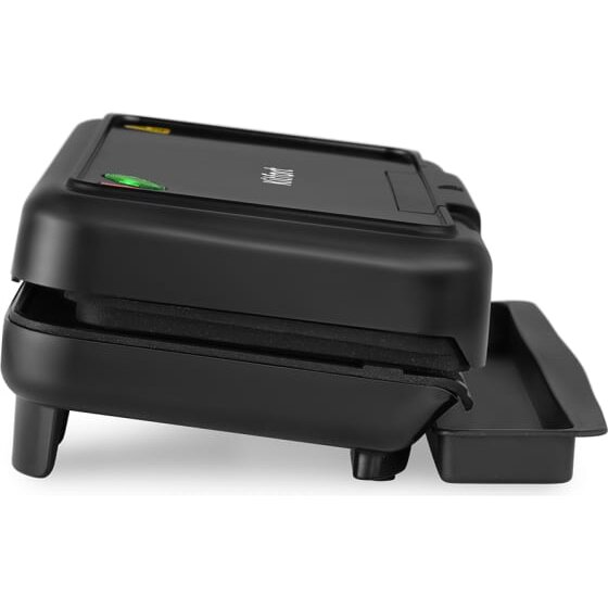 Благодаря особой конструкции прибора (панели гриля находятся под небольшим наклоном) жир и сок с продуктов стекают вниз в специальный поддон. Крышка гриля имеет подвижное соединение с корпусом, что позволяет готовить продукты больших размеров.