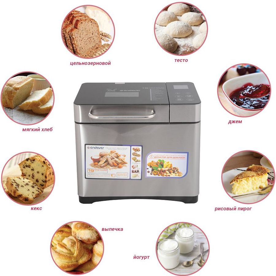Функции | диспенсер выбор размера хлеба / 500, 750, 900 г / выбор степени запекания таймер отсрочки старта / 15 часов / поддержание температуры / 60 минут / режим быстрой выпечки |