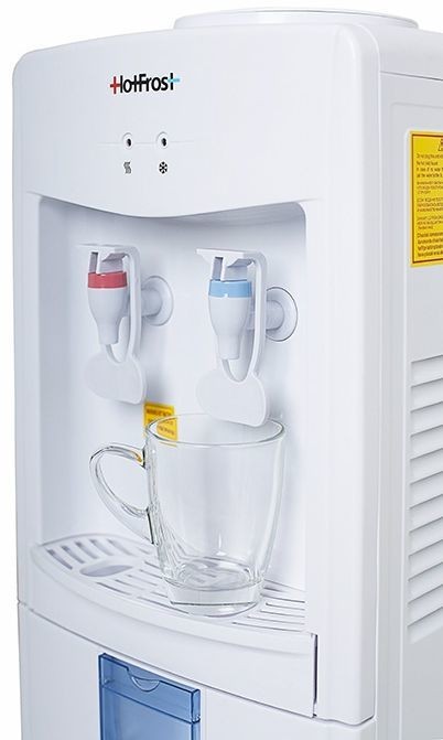 Описание: HotFrost V118E недорогой, но в то же время надежный кулер для воды. Наличие нажимных краников избавляет владельцев данной модели от излишних контактов с поверхностями кулера, что действительно очень гигиенично. Кроме этого, кулер оборудован откидным шкафчиком для хранения пластиковых стаканчиков.