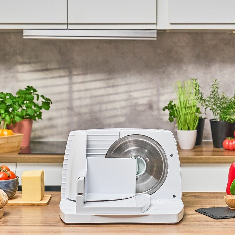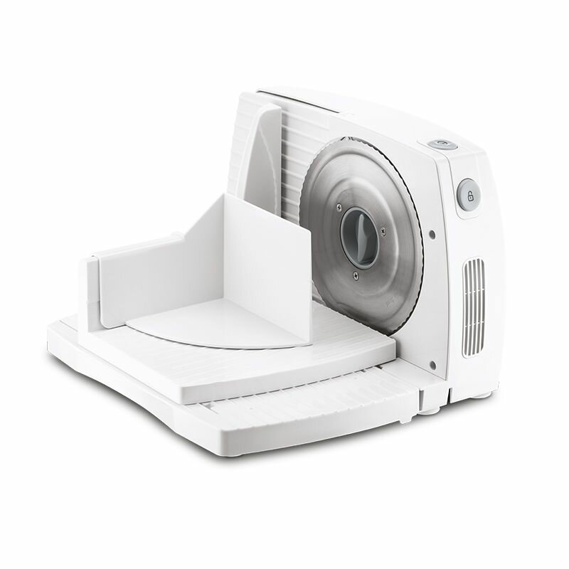 Ломтерезка электрическая ZELMER ZFS1016 оснащена мощным и надежным двигателем, который обеспечивает стабильную работу даже при высокой нагрузке. Антискользящие ножки гарантируют устойчивость устройства на любой поверхности, а благодаря компактным размерам слайсер легко вписывается в кухонное пространство и удобен в хранении. Корпус выполнен из прочного пластика, устойчивого к повреждениям, а система безопасности предотвращает случайное включение устройства, Нож можно легко заблокировать с помощью замка.