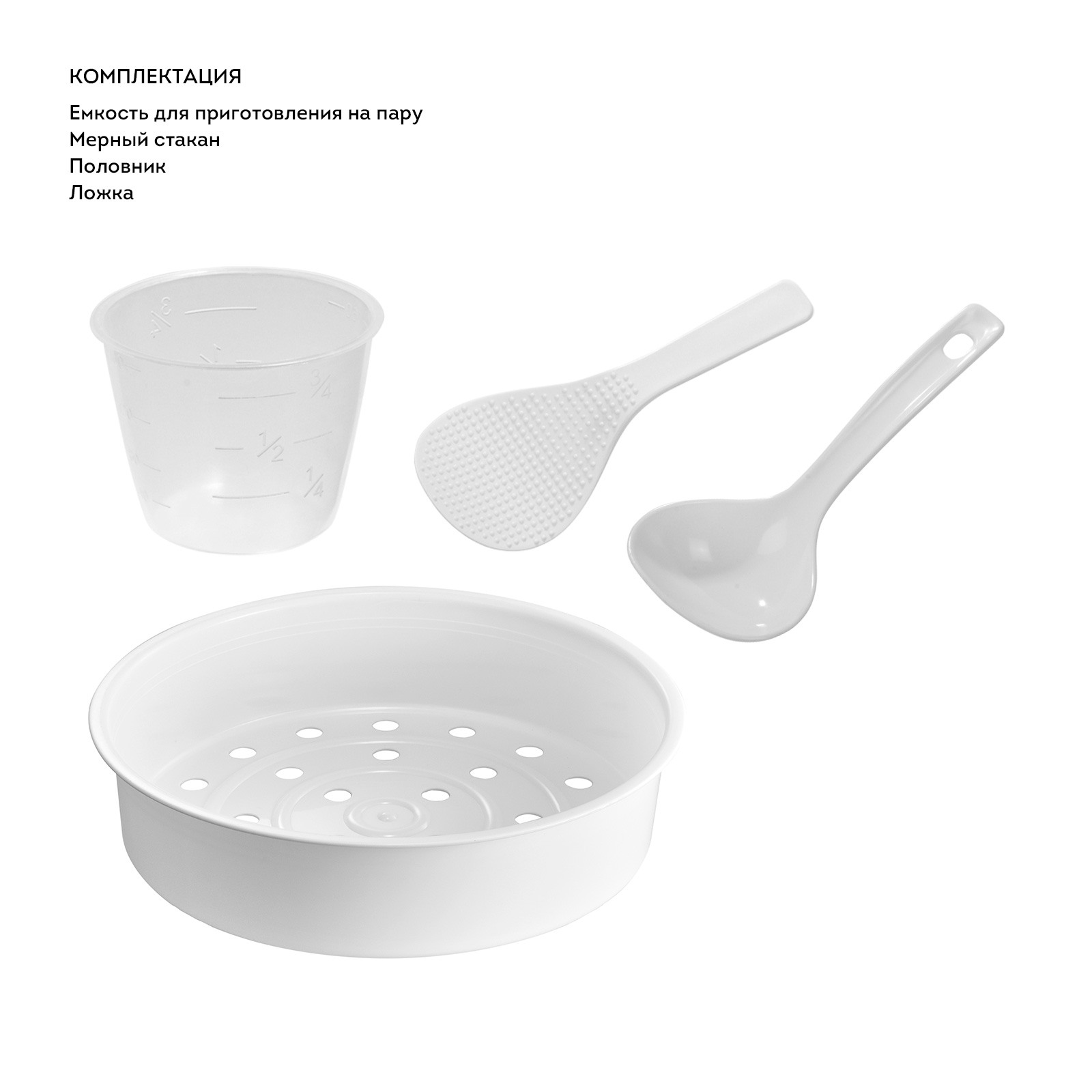 В комплекте: ложка, мерный стакан, емкость для приготовления на пару, половник.