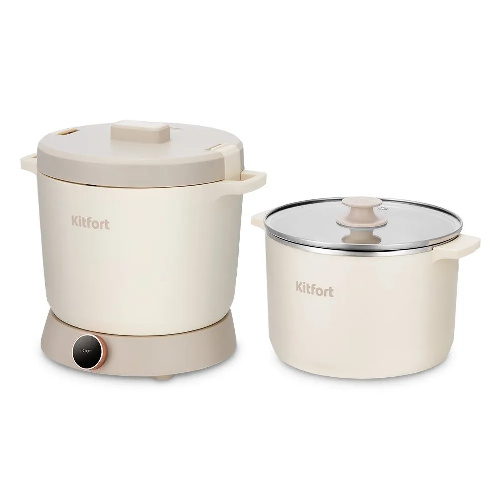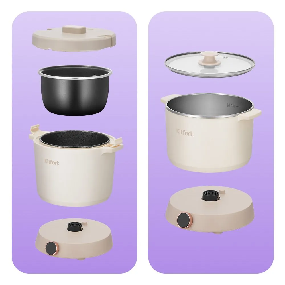 Мультиварка «2 в 1» КТ-221 приготовит мясные, овощные, рыбные блюда, блюда на пару, плов, крупу, потушит овощи, а также поможет испечь пирог. Прибор состоит из мультиварки с алюминиевой чашей, кастрюли из нержавеющей стали и подставки.
