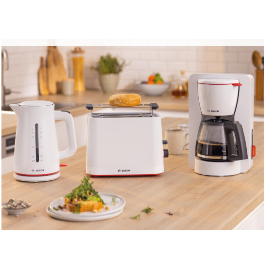 Чайник Bosch MyMoment TWK3M121-идеальное устройство для всех любителей хорошего чая и кофе. Бренд Bosch уже много лет славится качеством своей продукции, и этот чайник является прекрасным примером этого. Он имеет емкость 1,7 литра, поэтому вы можете приготовить нужное количество горячей воды для себя и своих гостей. Мощность 2400 Вт позволяет воде быстро кипеть, что особенно полезно в ситуациях, когда у нас мало времени. Изготовленный из пластика, чайник легкий и простой в эксплуатации, а плоский нагреватель гарантирует равномерный и быстрый нагрев воды. Благодаря белому цвету он идеально впишется в любую кухню.