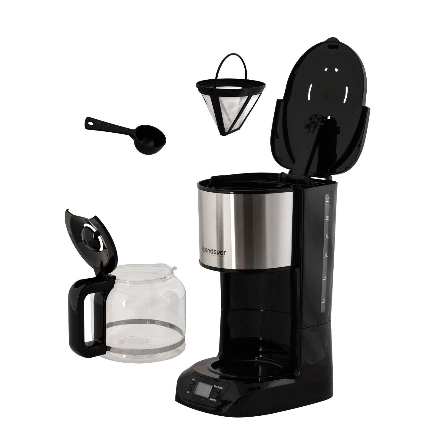 Тип кофеварки: капельный, Тип используемого кофе: молотый, Функция защиты от перегрева, Материал сетки фильтра: нейлон, LCD дисплей, Таймер отложенного старта до 24 часов, Функция индикации времени, Съемный многоразовый фильтр для кофе