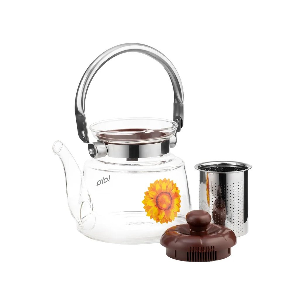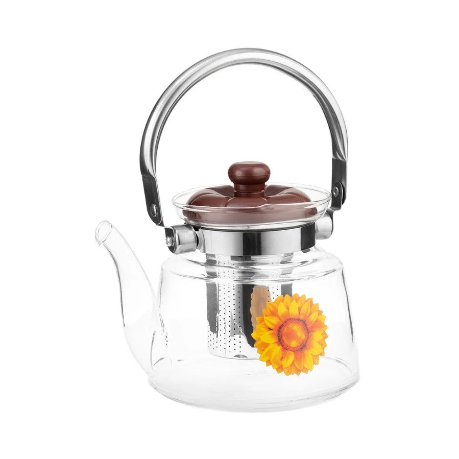 Заварочный чайник LARA то, что нужно, для любителя чайных церемоний. С его помощью вы сможете приготовить 4-5 порций ароматного напитка любых сортов и разновидностей. Рисунок на колбе в виде цветка подсолнуха дополняет образ, что позволяет чайнику вписаться в любой интерьер. При изготовлении были использованы экологически чистые и безопасные материалы. Высококачественное жаропрочное стекло подходит для электрических и газовых плит, вы можете смело ставить чайник на открытый огонь. Ручка из нержавейки и жароупорная бакелитовая крышка не нагреваются. Жёсткий фильтр для заваривания из нержавеющей стали легко снимается для мытья и очистки.