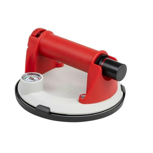 Вакуумная присоска предназначена для ручной переноски и укладки гладкой и мелкорифленой плитки. Присоска может удерживать груз весом до 100кг в течение нескольких часов. Механизм предусматривает наличие поршня создания вакуума с красным контрольным кольцом и манометром давления для дополнительного визуального контроля.